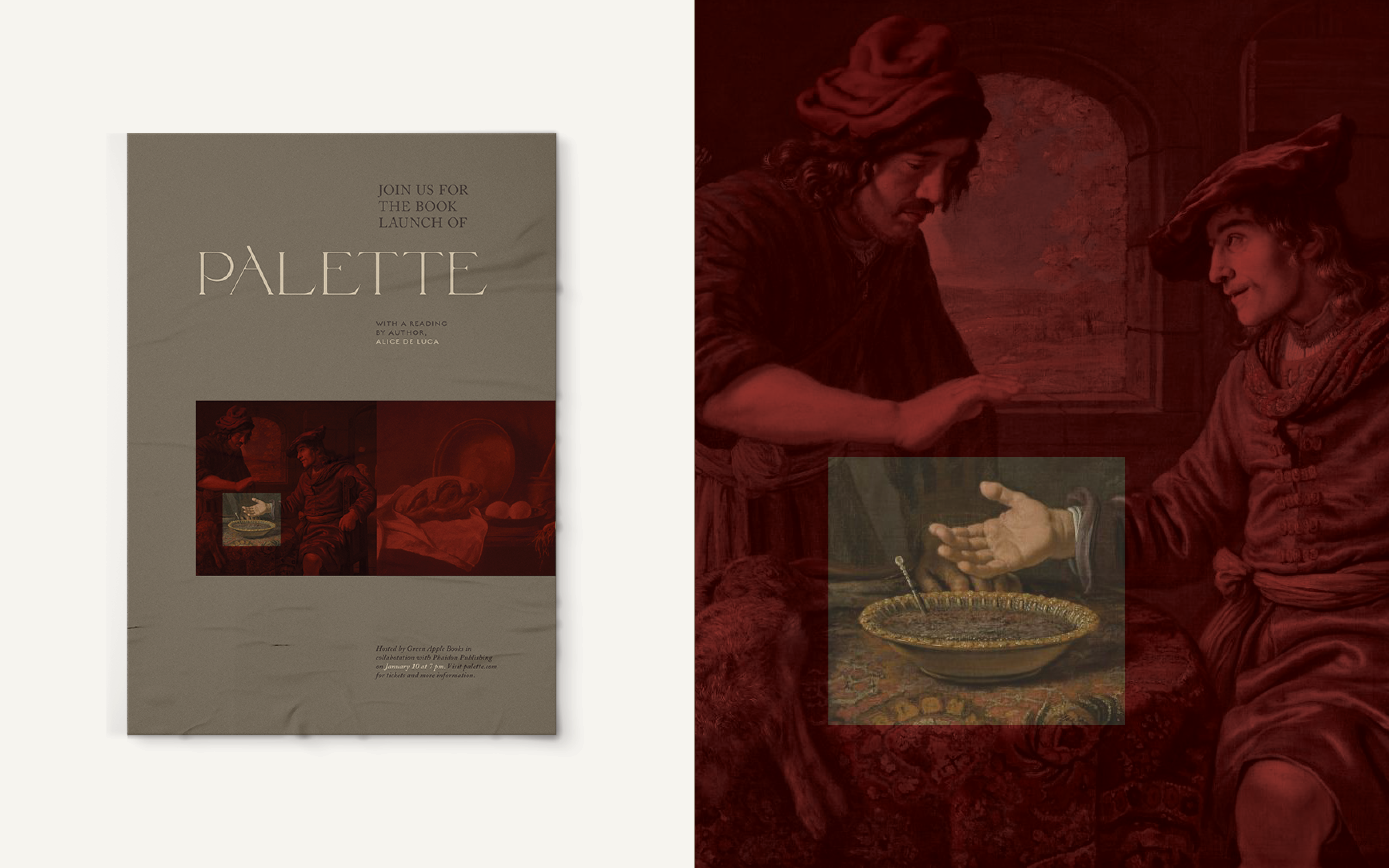 The cookbooks visuals take on a historic feeling with dark, warm, and muted colors that complement the luxurious typefaces used. Paintings were pulled from artist such as Leonardo Da Vinci, Pieter Brugal the Elder, and William Segar to enhance the historic aesthetic and give an accurate account of what food looked like in the early 15th century.